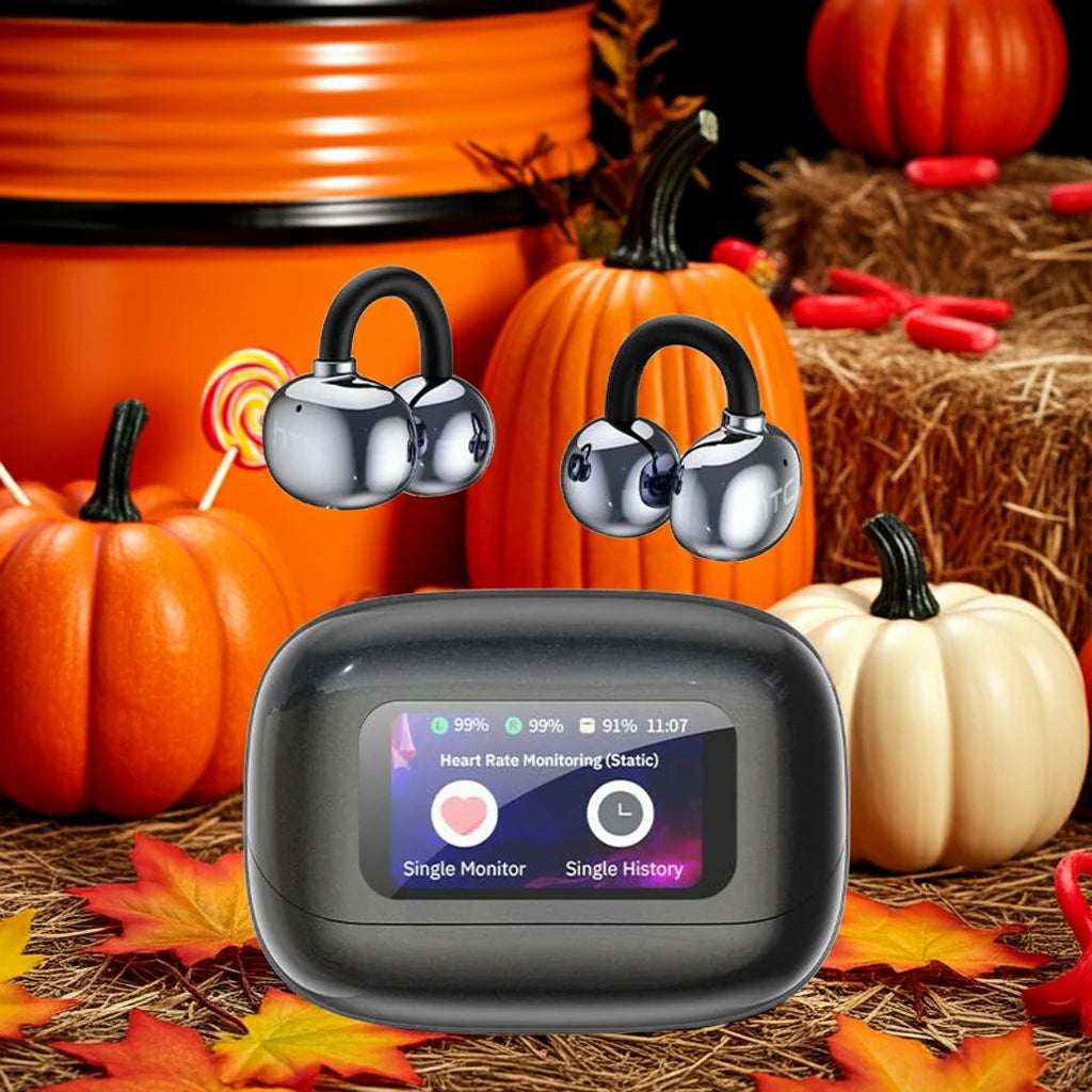 HTC NE41-OWS - Écouteurs à clip avec surveillance de l'oxygène dans le sang et de la fréquence cardiaque, casque Bluetooth (6.0), étanche IPX5, avec boîtier de charge, microphone intégré, réduction du bruit NC, port confortable, excellente qualité sonore
