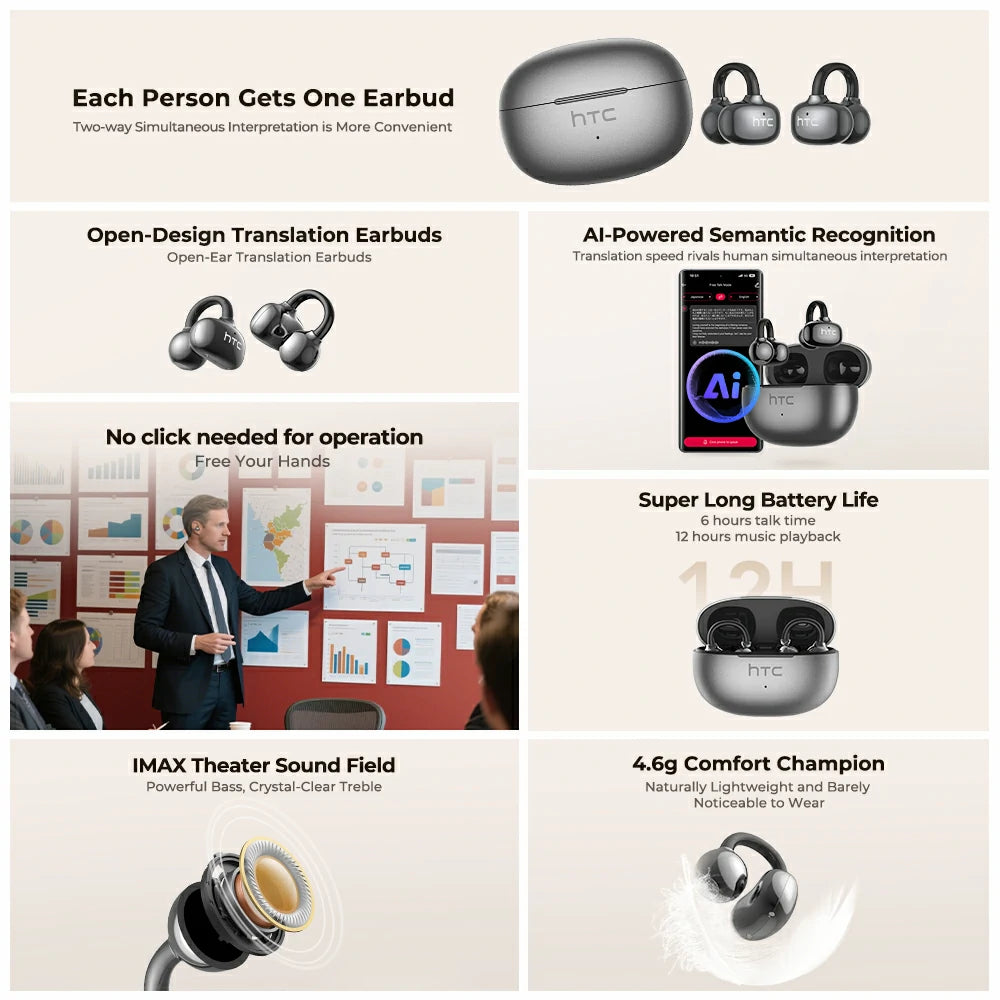 Communicate effortlessly with the HTC NE55 clip-on earphones. Featuring AI translation technology and a secure clip-on design, enjoy hands-free multilingual conversations with crystal-clear audio. Its lightweight, comfortable fit makes it perfect for work and travel, while intuitive controls keep you in command. Break down language barriers with ease.